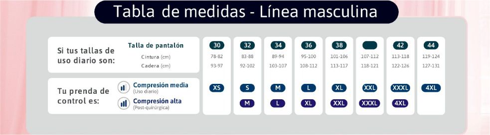 | Línea Masculina Comp Alta | L, M, XL, XXL, XXXL, 4XL |